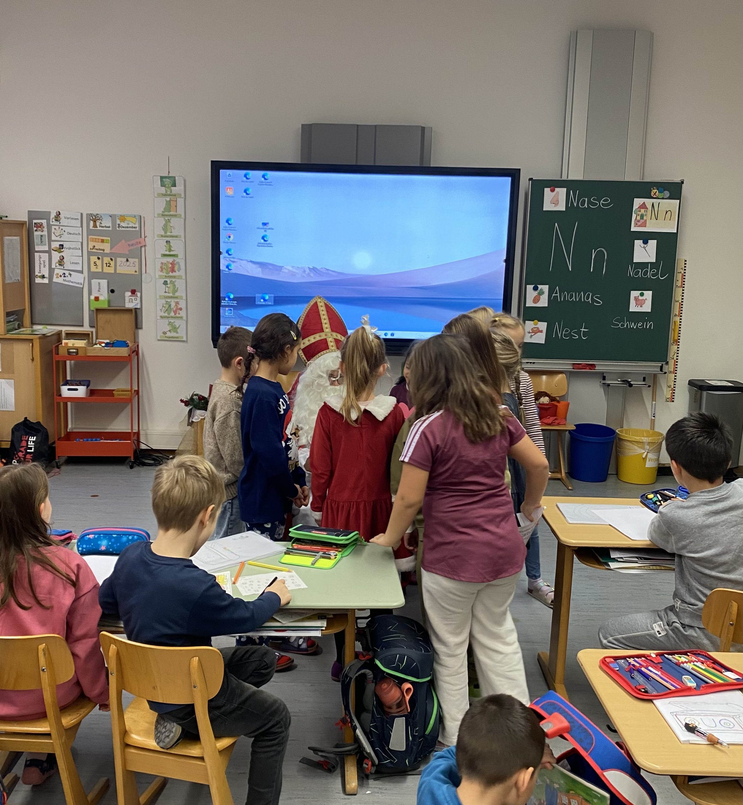 Der 06.12. ist der Nikolaustag. Auch in unserer Schule hat uns der Nikolaus besucht. Aber er kam schon am 5.12.. In den 1. und 2. Klassen hat der Nikolaus aus seinem „Goldenen Buch“ vorgelesen. Alle Kinder waren sehr gespannt, haben tolle Lieder gesungen, Gedichte vorgetragen und dem Nikolaus ein paar schöne Zeichnungen geschenkt.