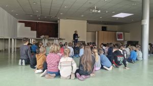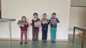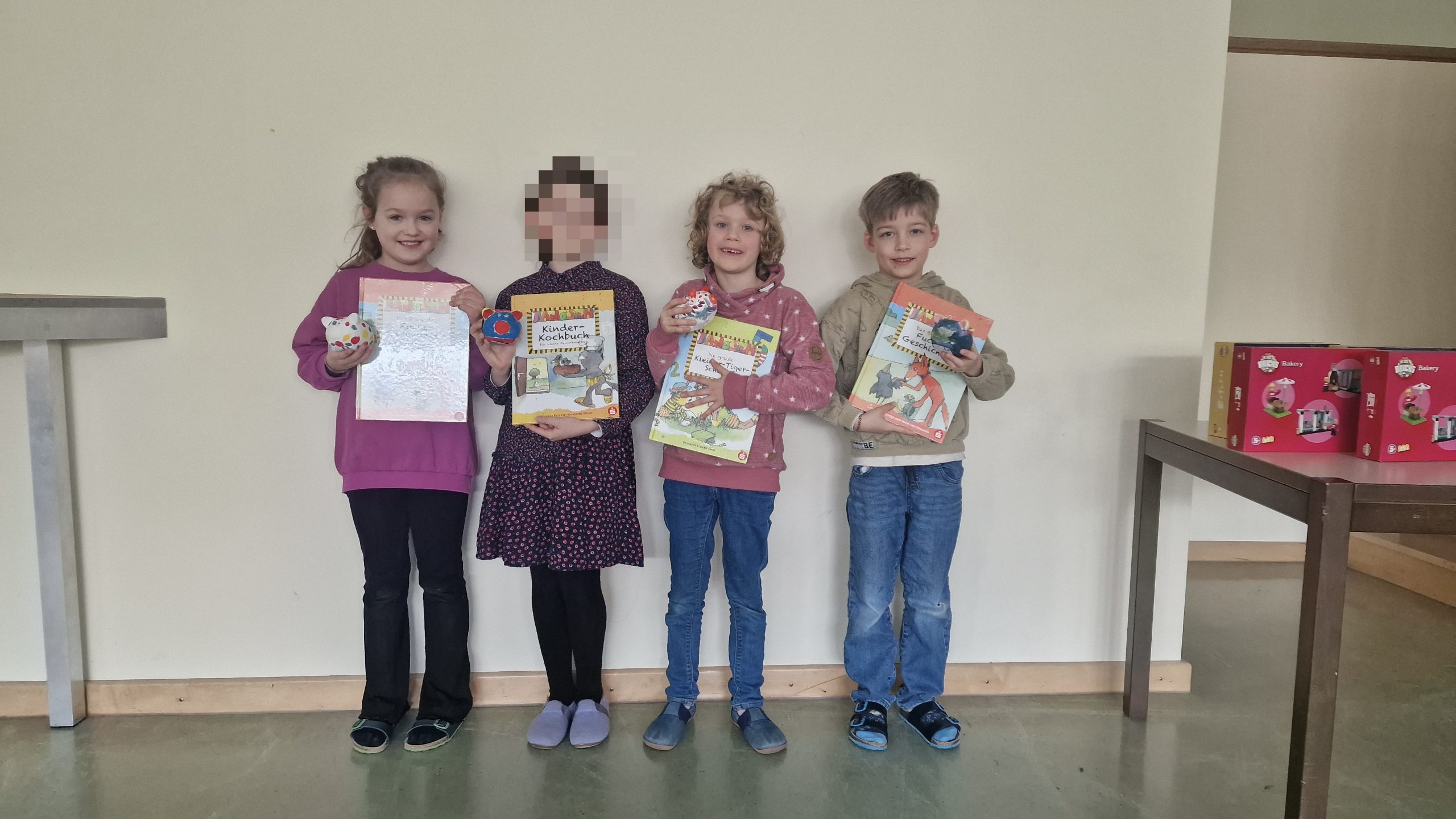 Jetzt wurden die Sieger der bemalten Schweinchen belohnt. Gemeinsam saßen alle Kinder der ersten Klassen in der Aula.